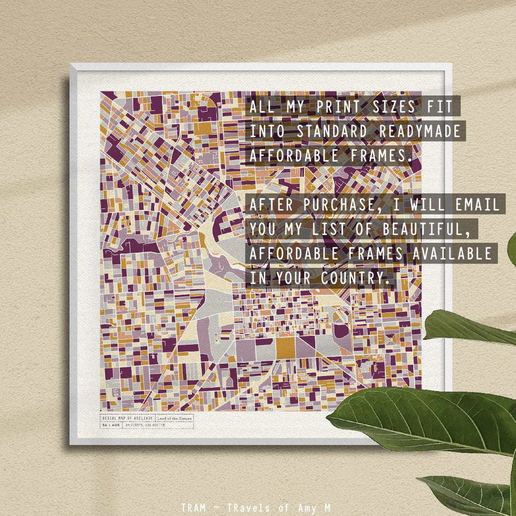 The gentle colour palette is inspired by those lovely sunset hues on the River Torrens. The text underneath the image says "Aerial Map of Adelaide, SA | AUS, Land of the Kaurna | 34.9285°S, 138.6007°E".