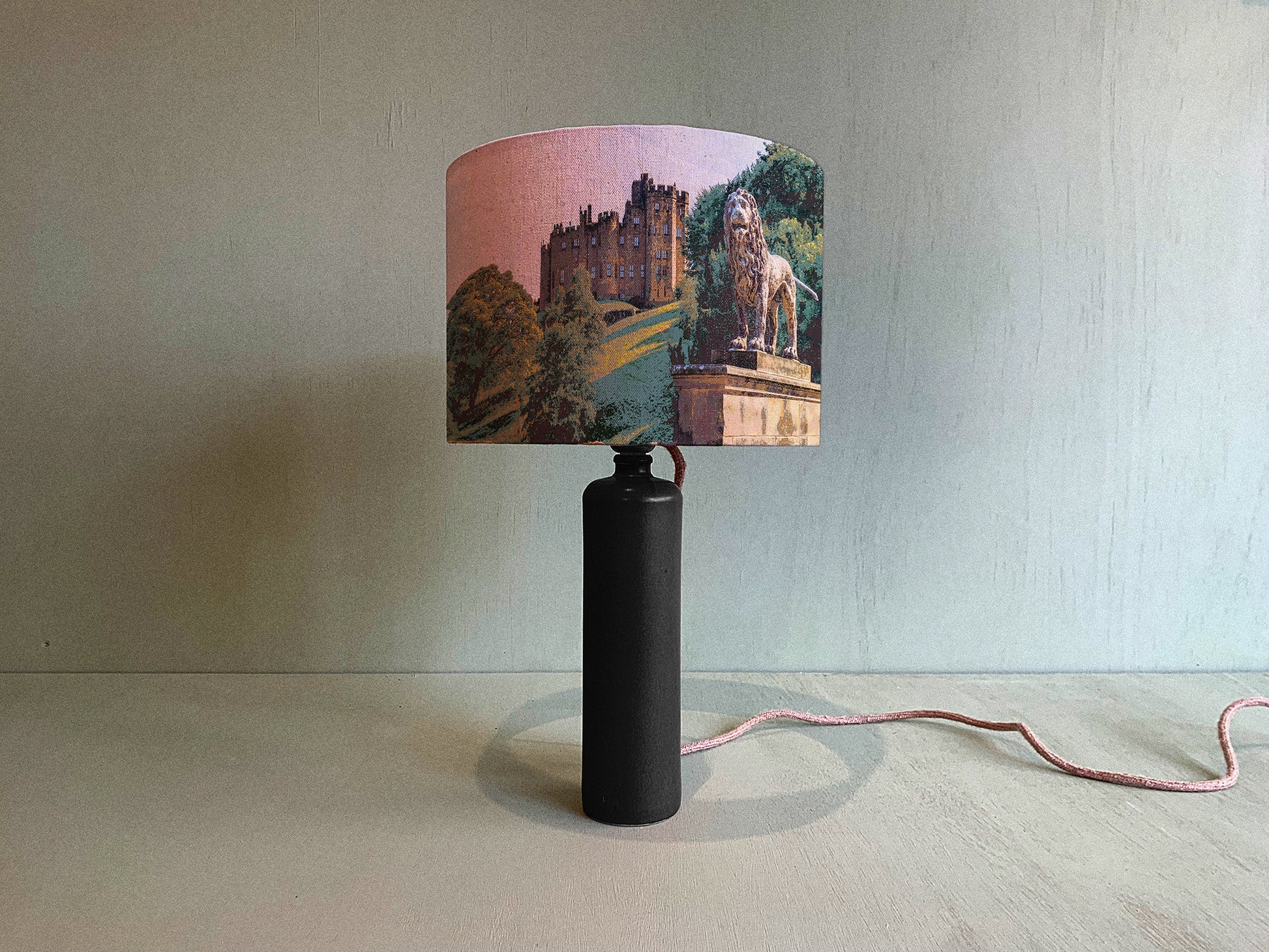 NOSTALGIC LANDSCAPE-INSPIRED ARTWORK, DIGITALLY PRINTED ONTO ORGANIC COTTON NATURAL FLECKED FABRIC, THEN HANDCRAFTED INTO A UNIQUE LAMPSHADE.