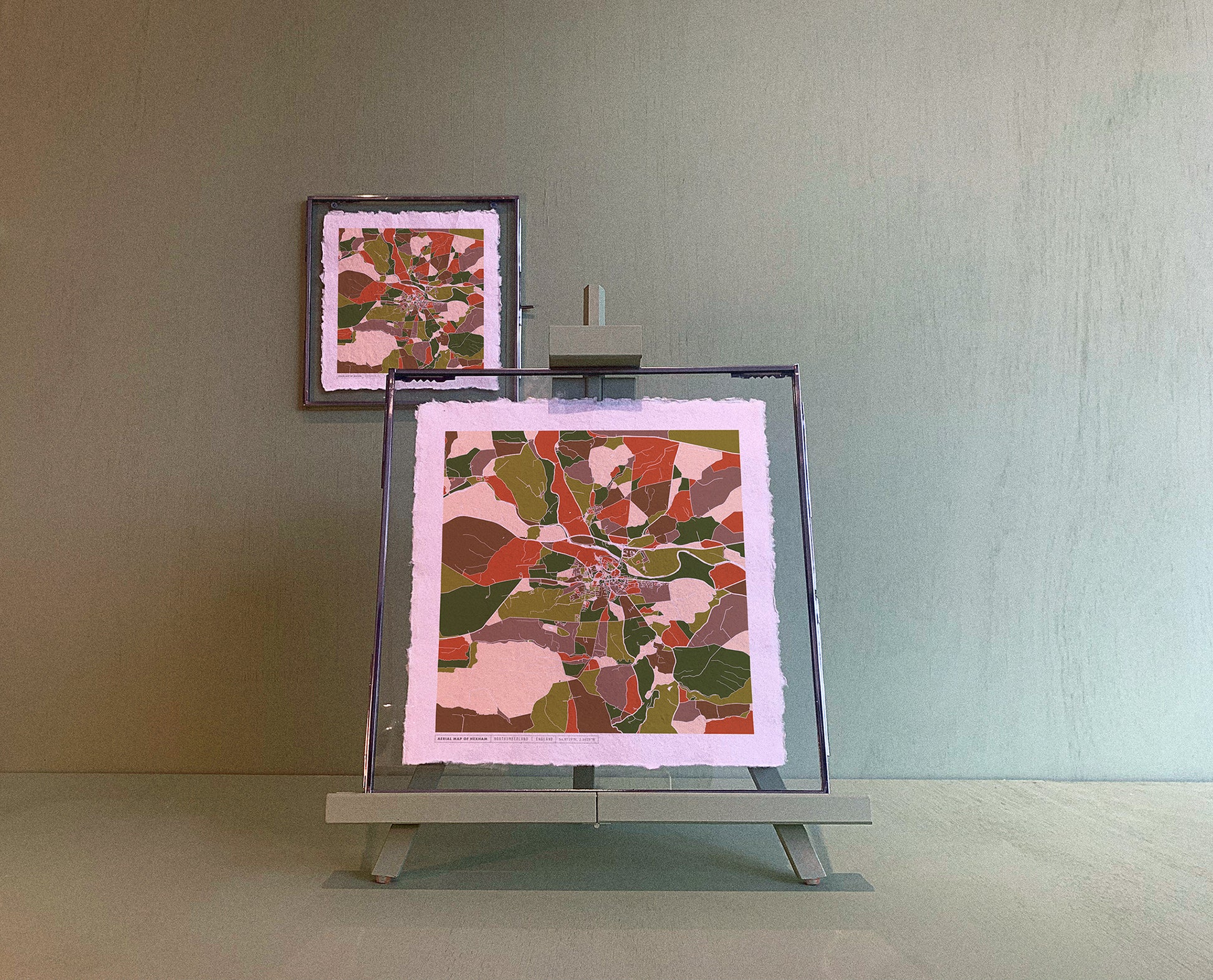 COLOURFUL AERIAL MAP DESIGN, GICLEE-PRINTED ONTO HANDMADE RECYCLED COTTON RAG PAPER, FOR A UNIQUE VINTAGE LOOK.