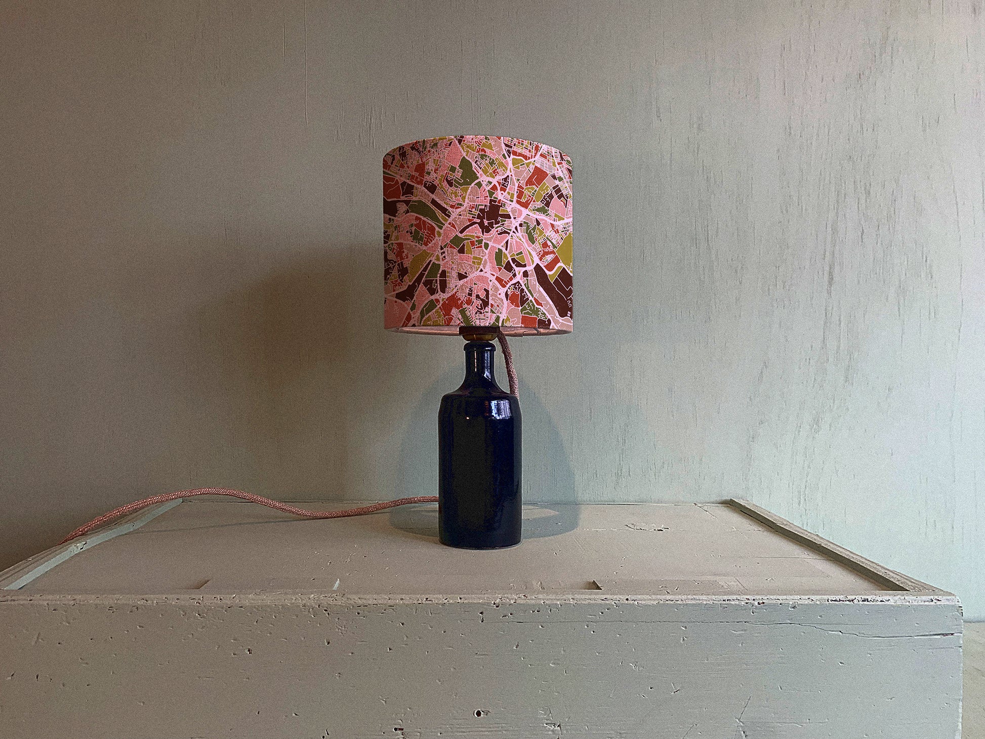 COLOURFUL AERIAL MAP DESIGN, DIGITALLY PRINTED ONTO ORGANIC COTTON NATURAL FLECKED FABRIC, THEN HANDCRAFTED INTO A UNIQUE LAMPSHADE.