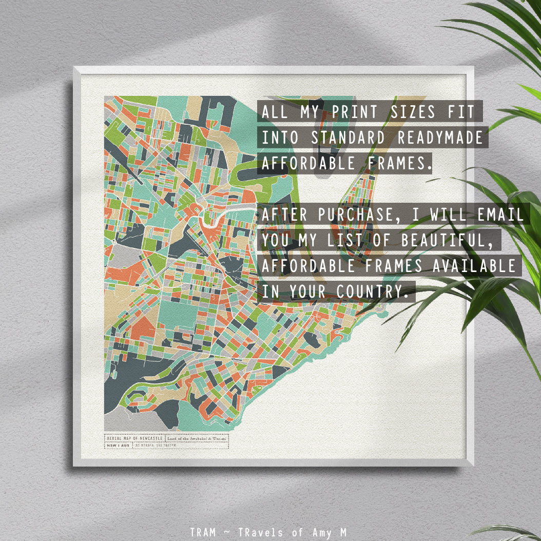 The distinctive colour palette combines the industrial colours of it’s working history with the bright colours of it’s beachside location. The text underneath the image says “Aerial Map of Newcastle, NSW | AUS, Land of the Awabakal & Worimi | 32.9283°S, 151.7817°E".