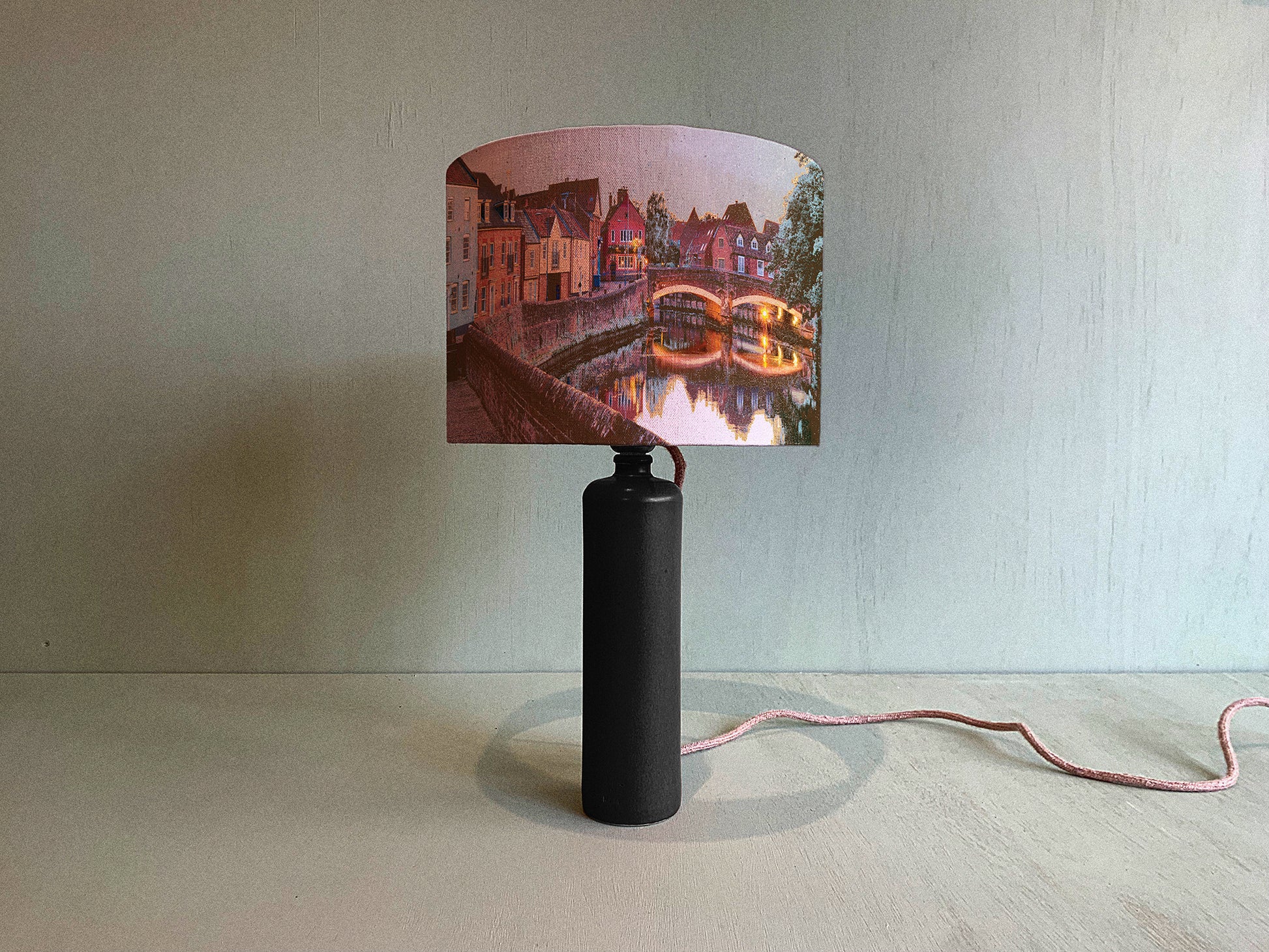 NOSTALGIC LANDSCAPE-INSPIRED ARTWORK, DIGITALLY PRINTED ONTO ORGANIC COTTON NATURAL FLECKED FABRIC, THEN HANDCRAFTED INTO A UNIQUE LAMPSHADE.