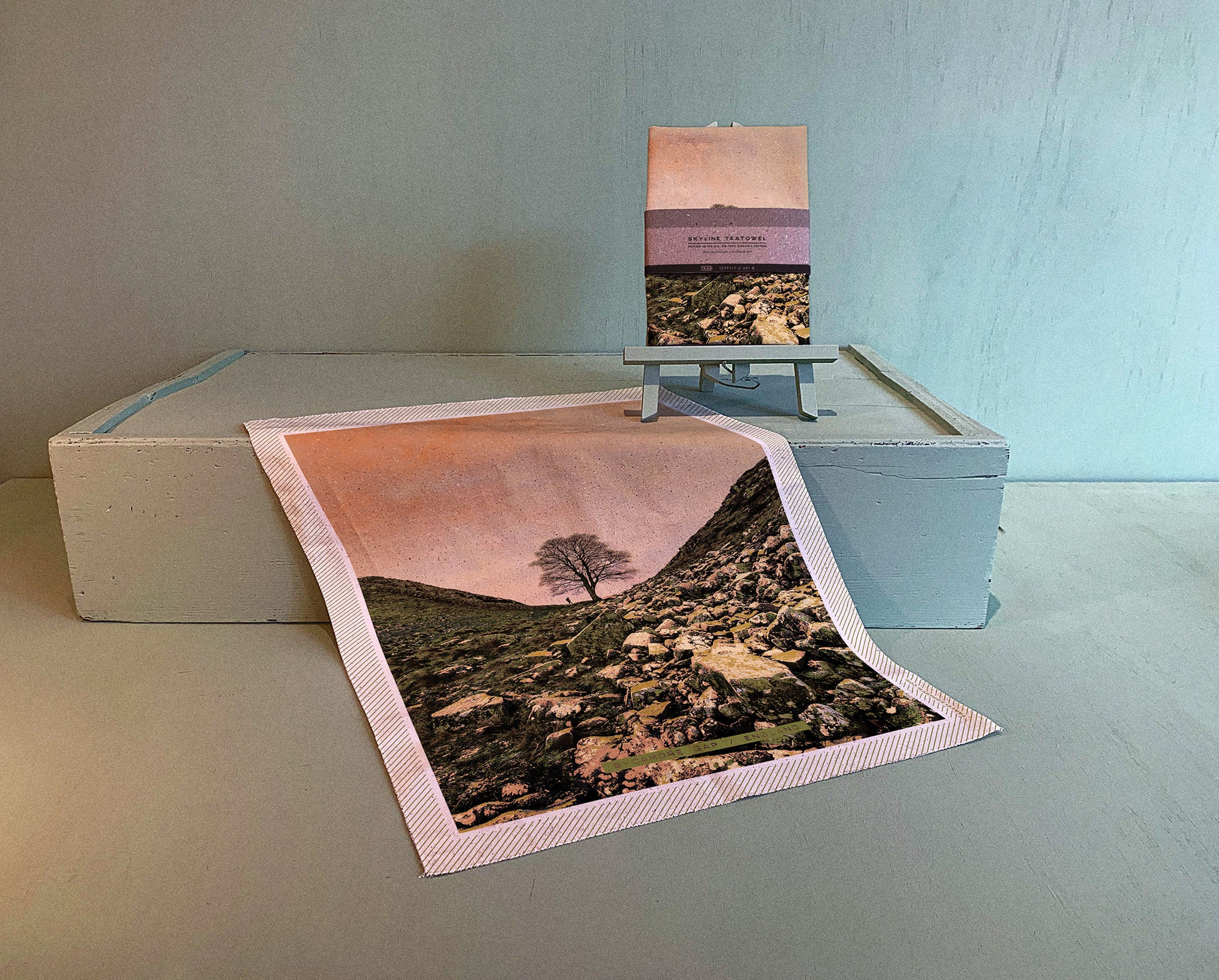NOSTALGIC LANDSCAPE-INSPIRED ARTWORK, DIGITALLY PRINTED ONTO HEAVYWEIGHT ORGANIC COTTON, WITH RAW-EDGE HEMMING.
